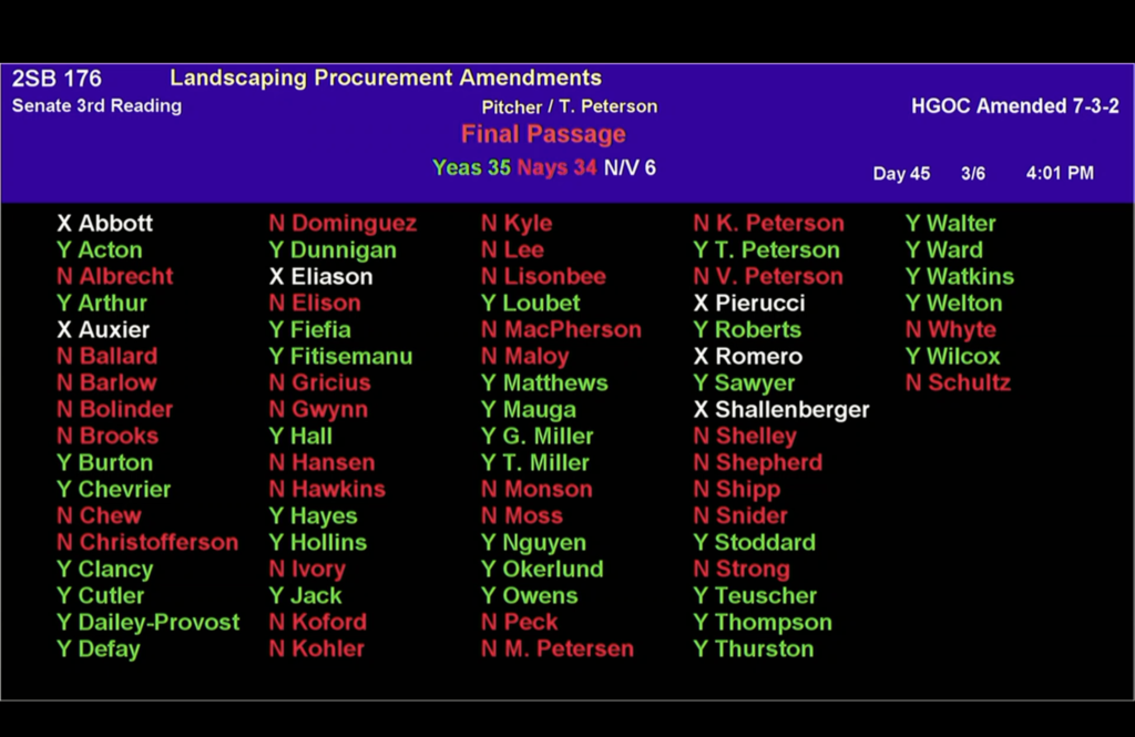 🌱 SB176 – Landscaping Procurement Amendments: One of my favorite bills this session. This bill requires state facilities along the Wasatch Front to replace their two-stroke lawn equipment with electric-powered lawn equipment when the old equipment is ready to retire. I ran this bill to help reduce harmful emissions produced by two-stroke engines.
